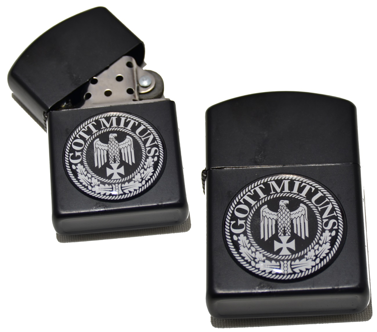 Das Benzinfeuerzeug Gott mit uns ist auf beiden Seiten mit je einem Gott mit uns 3D Aufkleber veredelt.