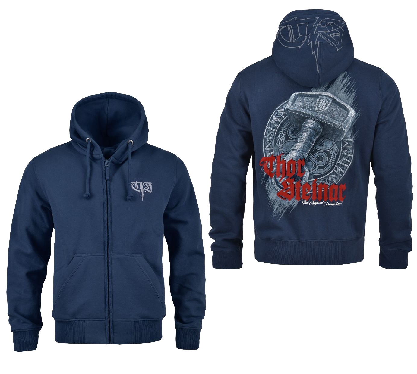 Thor Steinar Kapujacke mit großem Wikinger-Motiv auf dem Rücken. TS-Logo auf Kapuze und Brust. Innenfutter in Kontrast und Kapuze mit dicken Kordeln.
