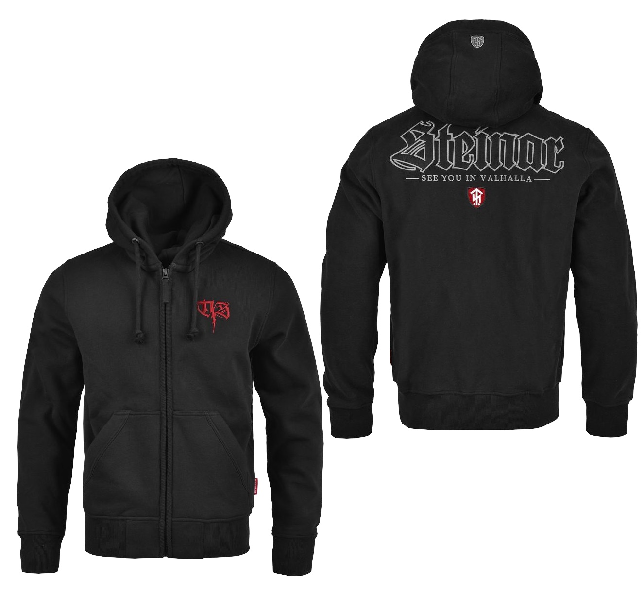 Thor Steinar Kapuzenjacke mit Wikinger-Motiv auf dem Rücken - See you in Valhalla -; und gesticktem TS-Logo. TS-Patch auf der Kapuze. Gesticktes TS-Logo auf der Brust. Zwei Eingrifftaschen seitlich und Kapuze mit dicken Kordeln.