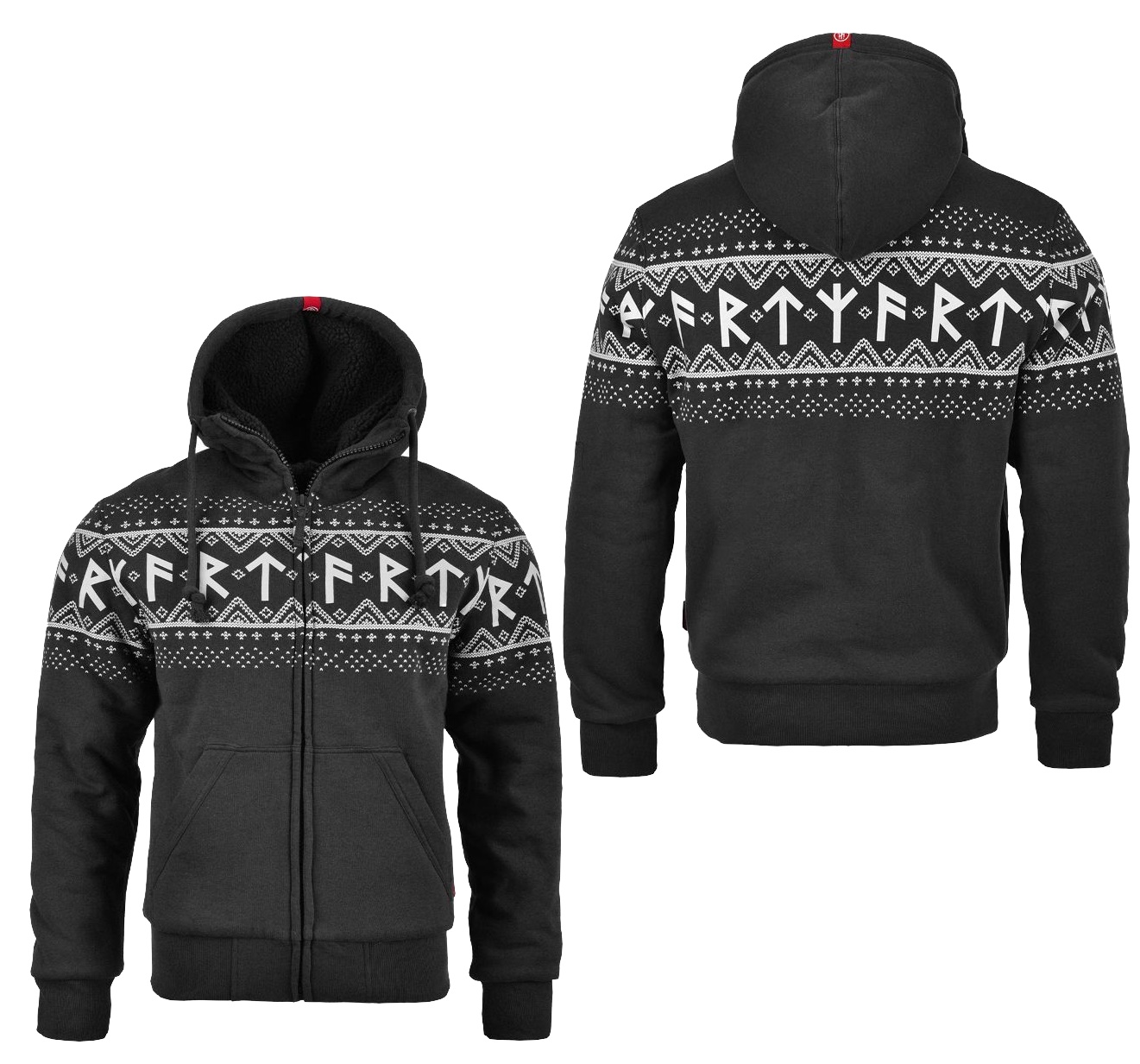 Warm gefütterte Thor Steinar Kapuzenjacke mit Fellimitat und hochschließendem Kragen. Rundum Runenmuster und Kapuze mit dicken Kordeln.