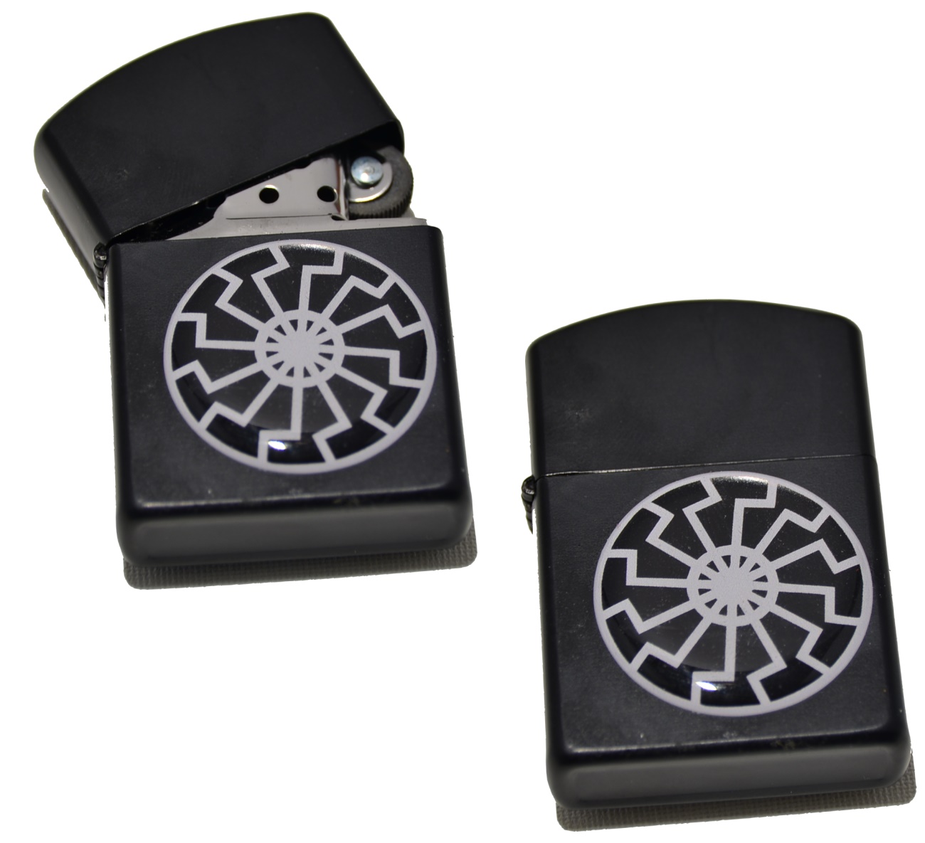 Sturm-/Benzinfeuerzeug Schwarze Sonne mit Schwarze Sonne Sticker in weiß.