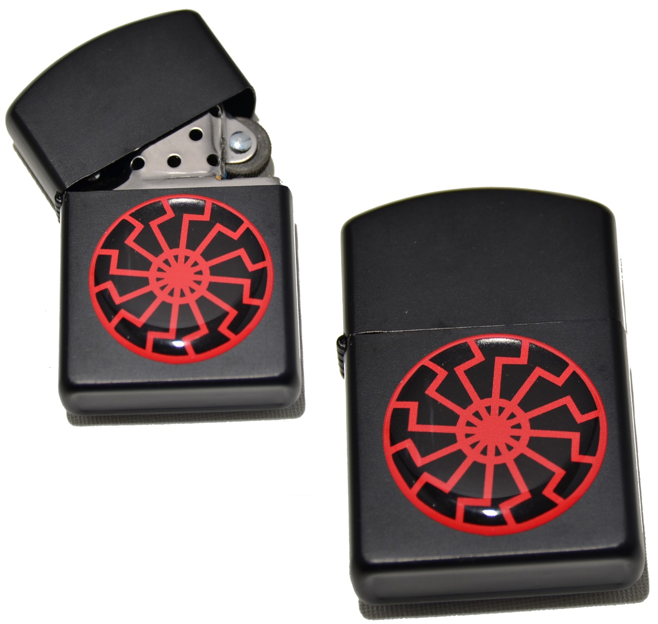 Sturm-/Benzinfeuerzeug Schwarze Sonne mit Schwarze Sonne Sticker in rot.