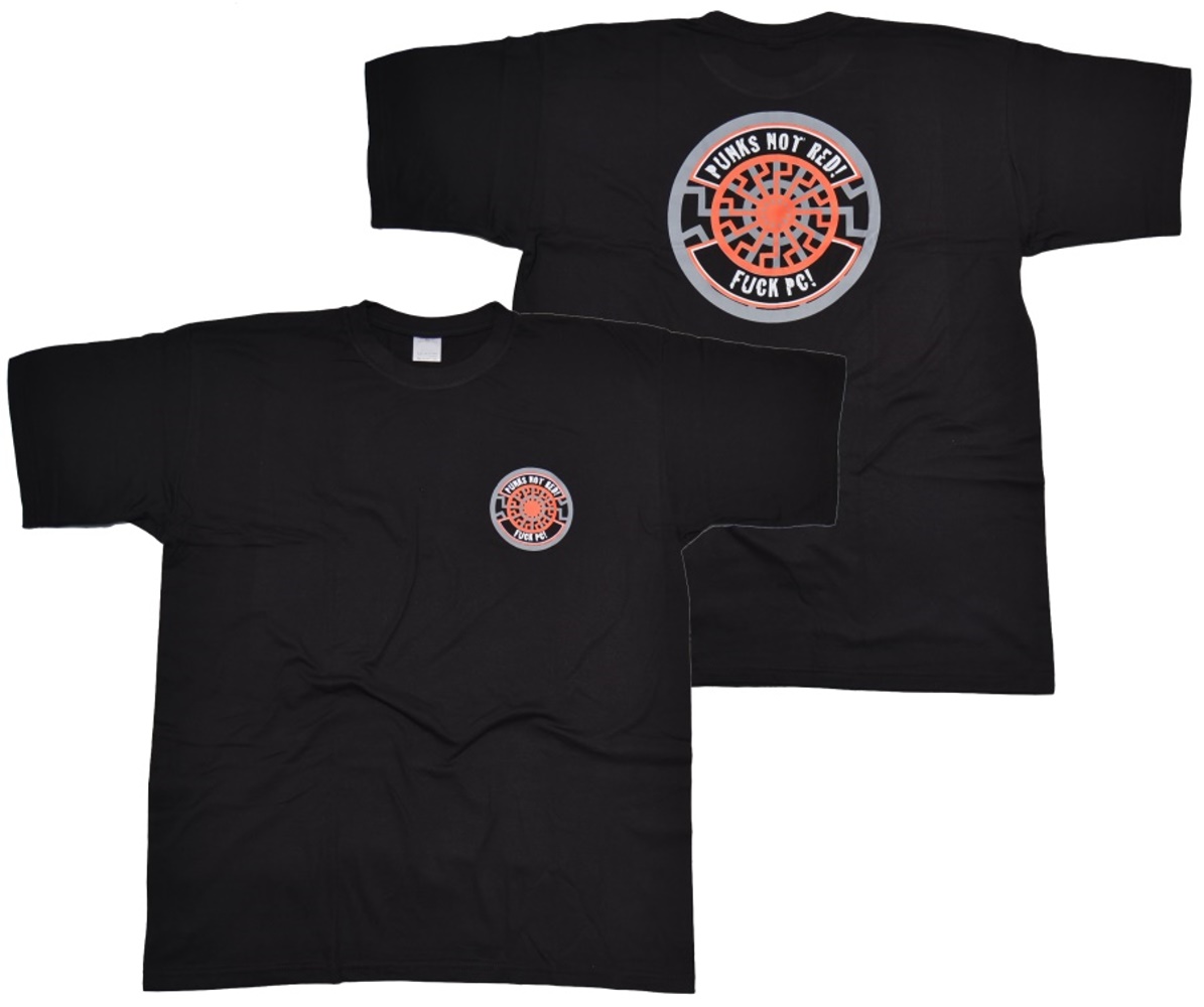 T-Shirt mit kleinem Motiv-Druck auf linker Brust, großer Motiv-Druck auf dem Rücken: - Punks Not Red! Fuck PC! -