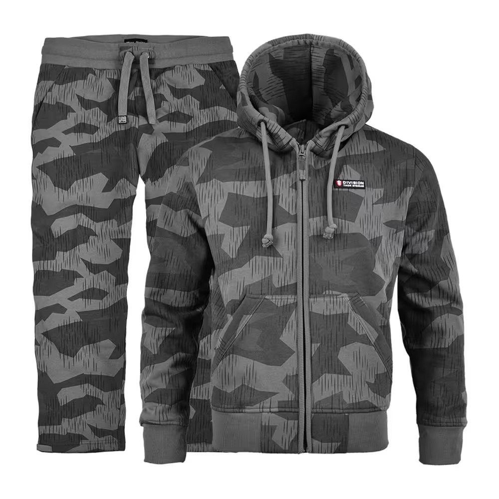 Thor Steinar Freizeitanzug im Tarnmuster – bequem, sportlich und markant. Kapuzenjacke mit verdecktem Reißverschluss / angesetzte Belege an Taschen und der Kapuzenkante / 3D Runendruck an der Kapuzen Rückseite / geprägter Brustpatch / Hose mit weichem Bund und breiten Kordeln mit gewebten Logo Label / Bund und Saumweite sind verstellbar / seitliche Einschubtaschen.