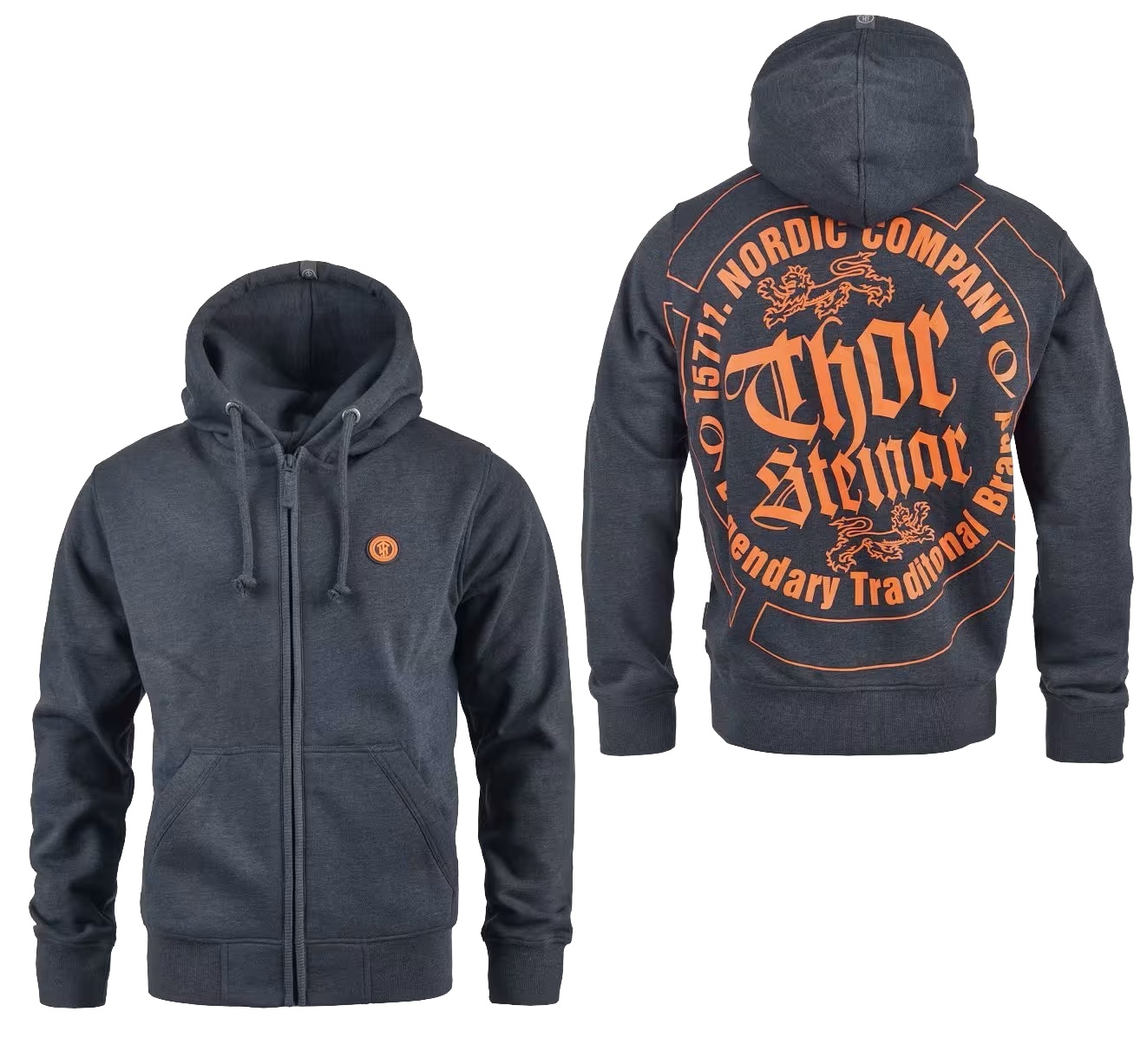 Plakative Thor Steinar Kapuzenjacke mit großem Logodruck auf dem Rücken.