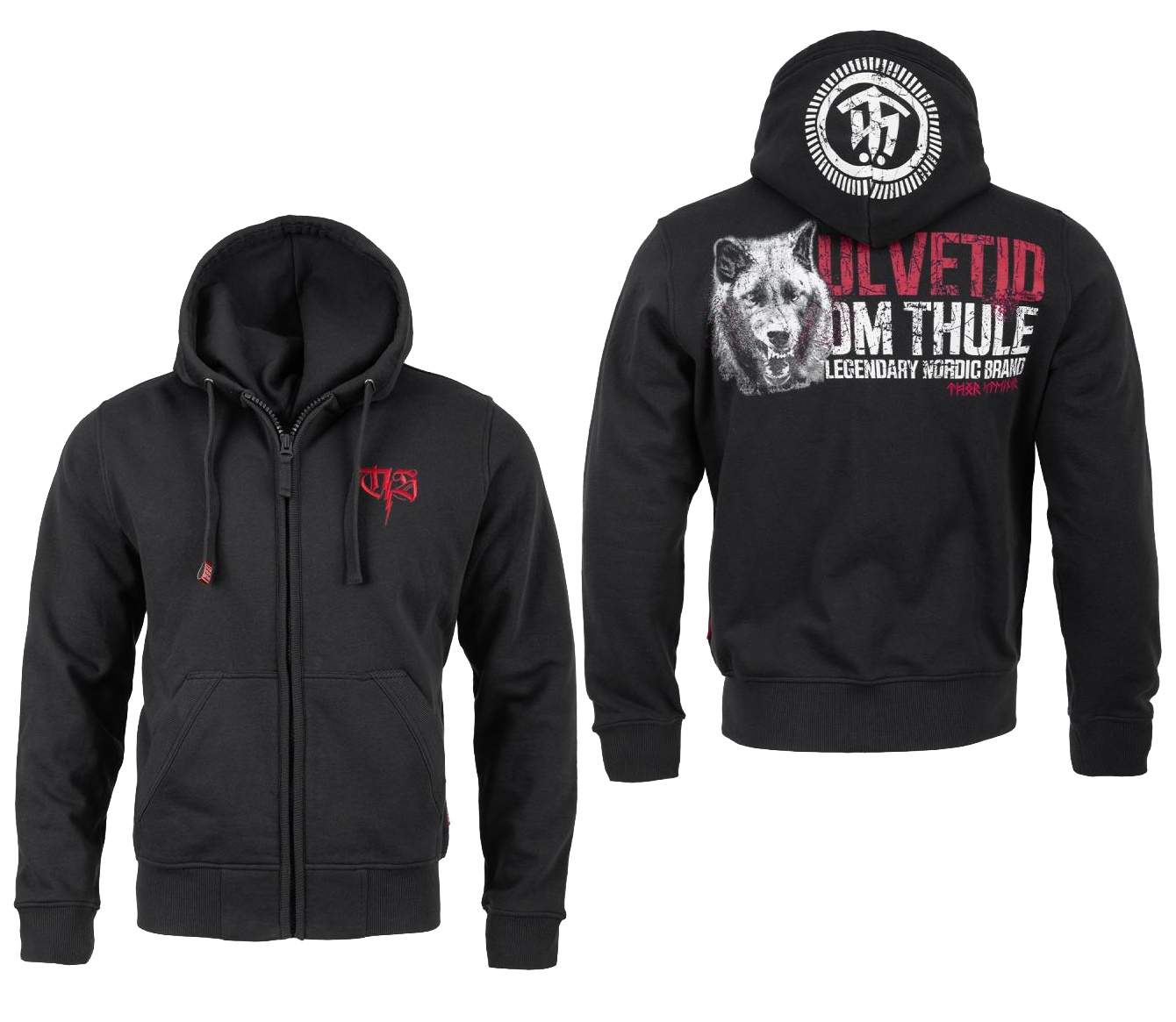 Thor Steinar Kapuzenjacke mit Wolf-Motiv auf dem Rücken; vorn kleines TS-Logo; altes TS-Logo auf der Kapuze. Zwei Eingrifftaschen seitlich und Kapuze mit dicken Kordeln.