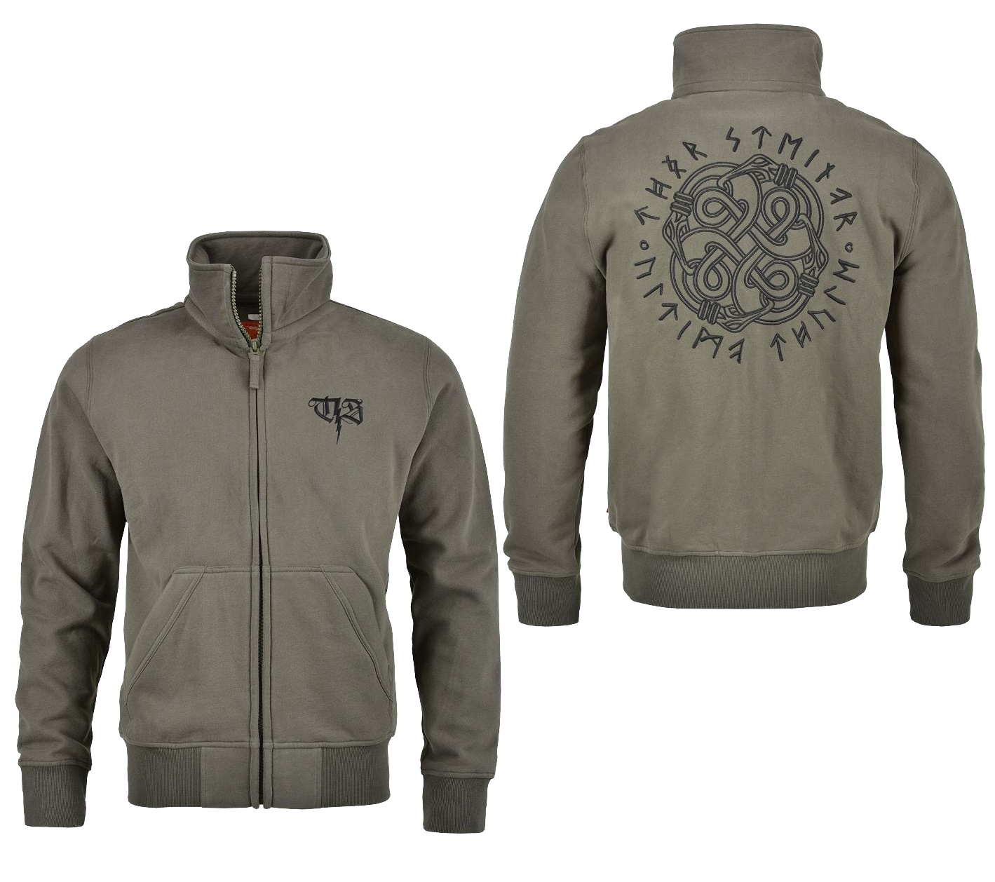 Thor Steinar Sweatjacke mit hochschließendem Kragen. Wikinger-Motiv und gestickter Thor Steiner Schriftzug in Runenschrift auf dem Rücken. Gesticktes TS-Logo auf der Brust.