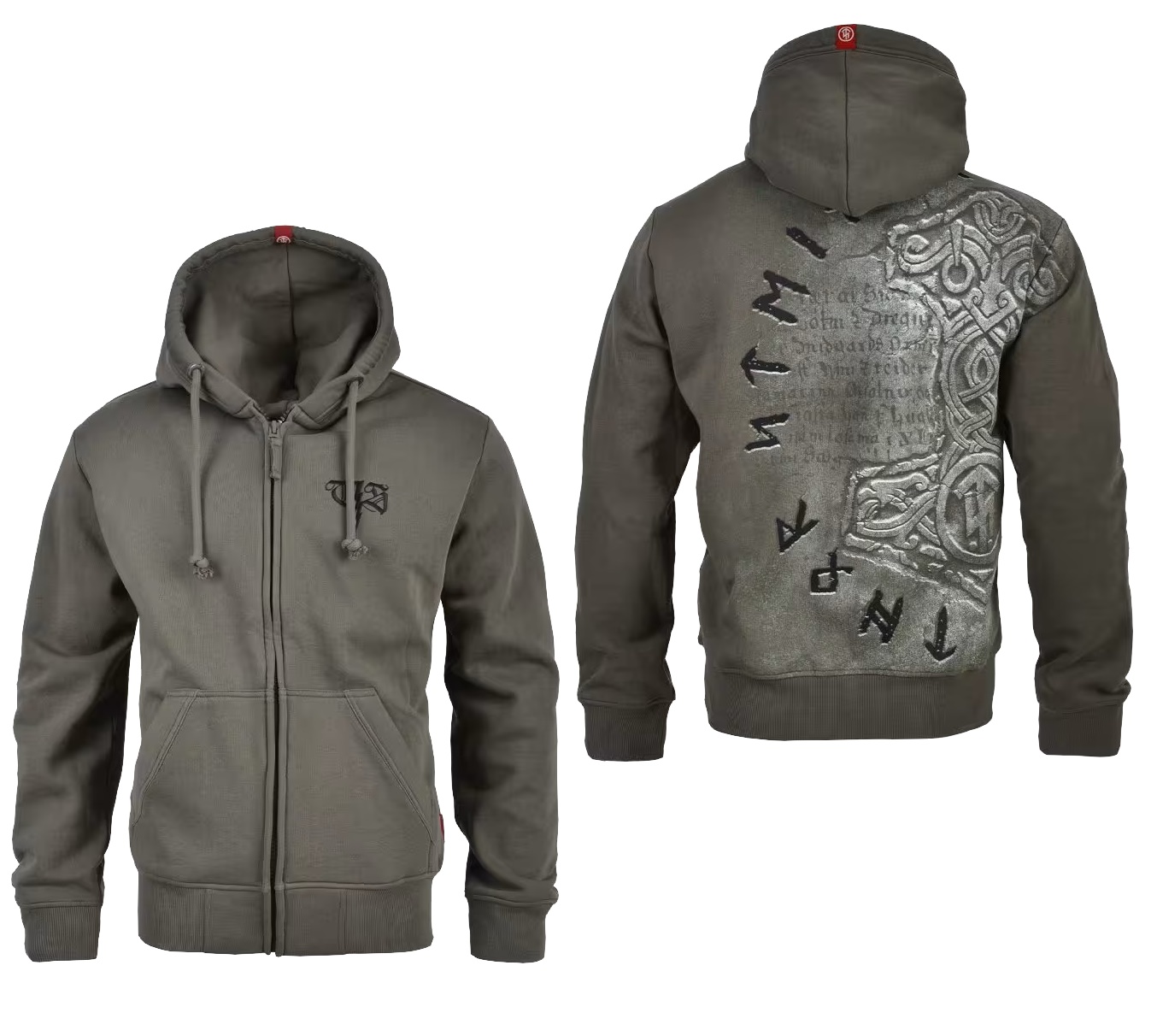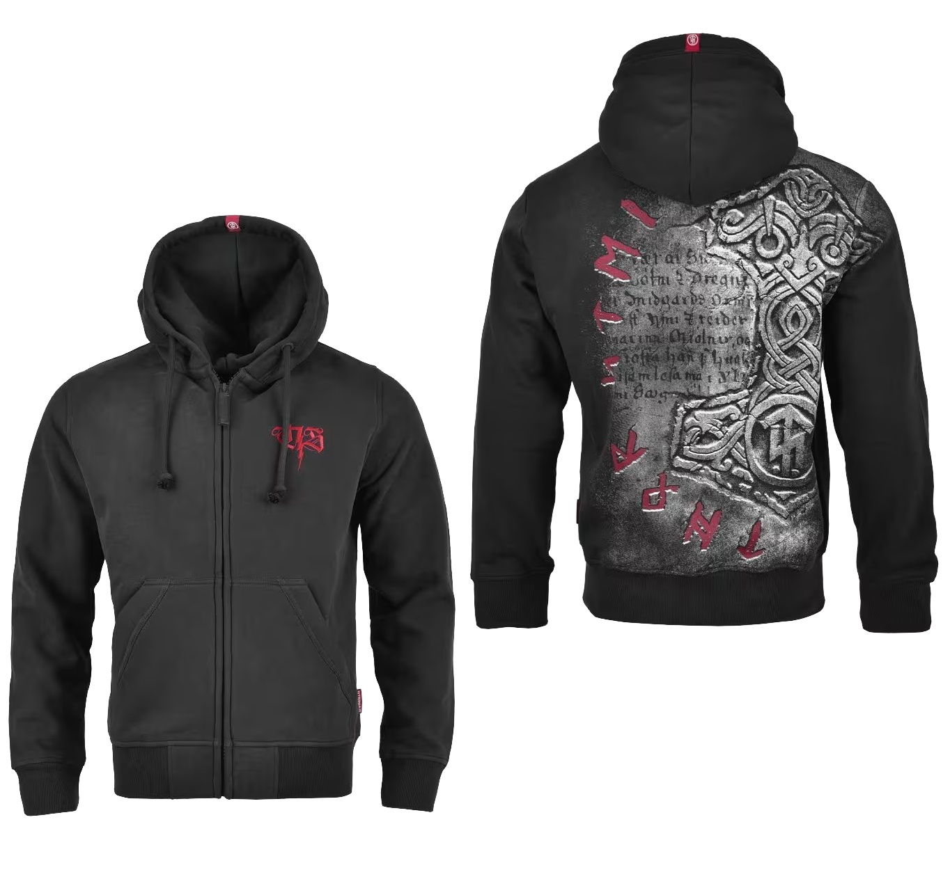Thor Steinar Kapuzenjacke mit Viking Motiv auf dem Rücken; vorn kleines TS-Logo. Zwei Eingrifftaschen seitlich und Kapuze mit dicken Kordeln.