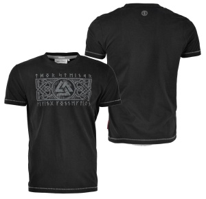 Eng geschnittenes Thor Steinar T-Shirt mit Rundhalsausschnitt. Aufwendiges Wikinger-Motiv aus einem Wotansknoten und gedruckten Runen als Frontmotiv, sowie ein kleines gedrucktes Nackenmotiv; Saum und Ärmelnähte in Kontrast.