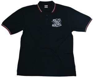 Polo Shirt Unser Sonne Schein..., kleiner Motiv-Druck auf linker Brust: - Unserer Sonne Schein, wird euer Ende sein! -; rot/weiße Kontraststreifen.